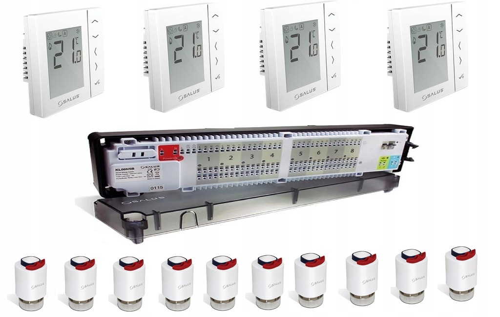 - Głowice termiczne – umożliwiające zamykanie/otwieranie poszczególnych pętli podłogówki.
