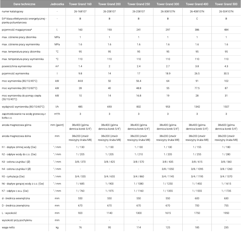 W zbiorniku zastosowano znacznie powiększoną wężownicę spiralną – nawet ponad 2 razy większą w porównaniu z klasycznym wymiennikiem c.w.u. – o powierzchni od 1,4m2 dla wymiennika Tower Grand 160 do 4,3m2 dla wymiennika Tower Grand 500. Dzięki takiemu rozwiązaniu stanowi on optymalne rozwiązanie dla instalacji z pompą ciepła zarówno typu on-off jak i inwerterową. Szeroki zakres pojemności od 160 do 500 litrów pozwala natomiast na dopasowanie go do wymogów pomp ciepła zarówno o małej jak i większej mocy.